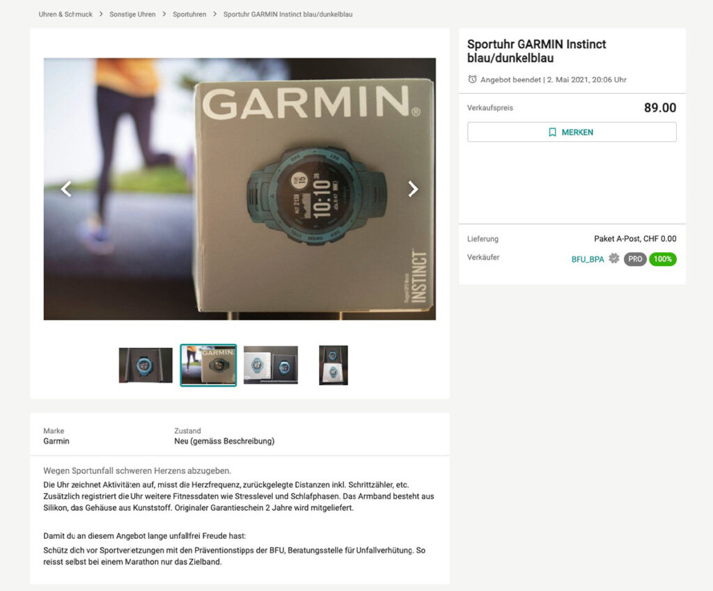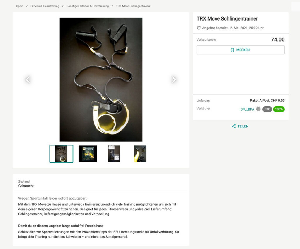 Auf Online-Plattformen wurden gut erhaltene Sportartikel angeboten, die nach einem Unfall nicht mehr gebraucht wurden. Mit Verweis auf die BFU-Präventionstipps. Dazu Franziska Hartmann, BFU-Kampagnenleiterin: «Mit der unkonventionellen Idee von Ruf Lanz konnten wir pro Angebot über 3000 Sportfans erreichen. Ohne Streuverlust und zu tiefen Kontaktpreisen.»
