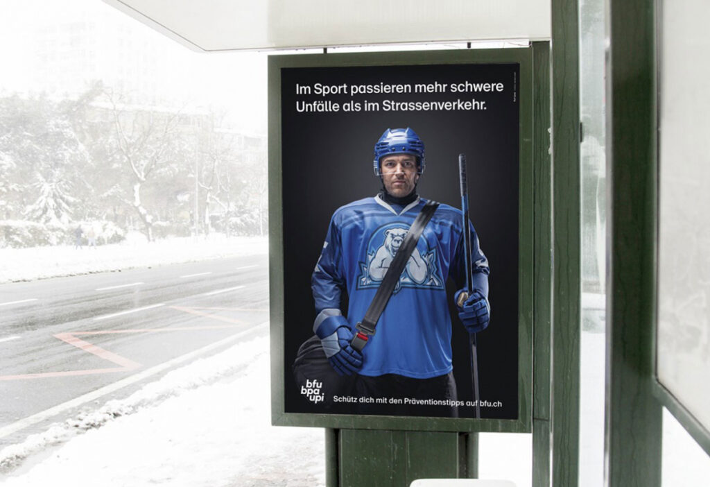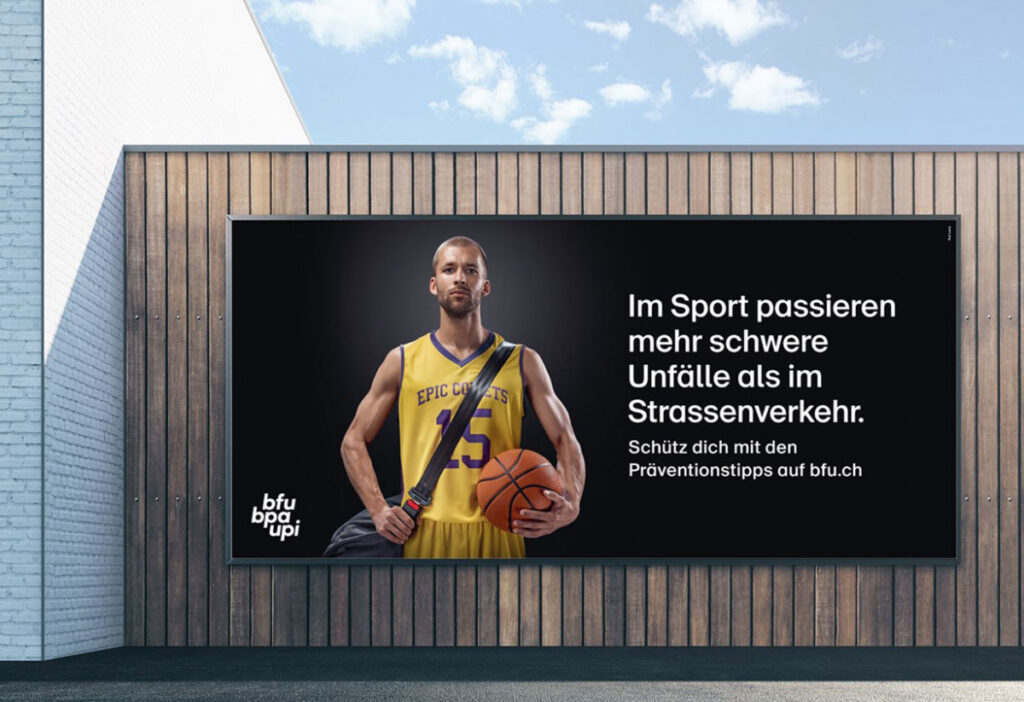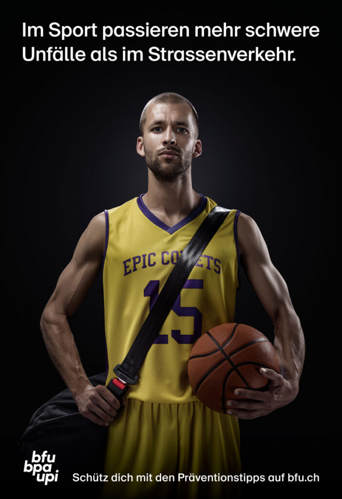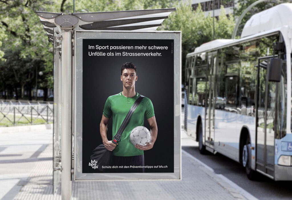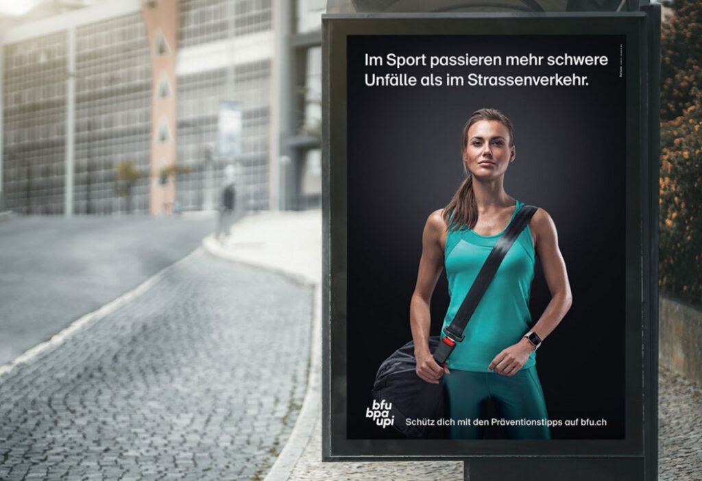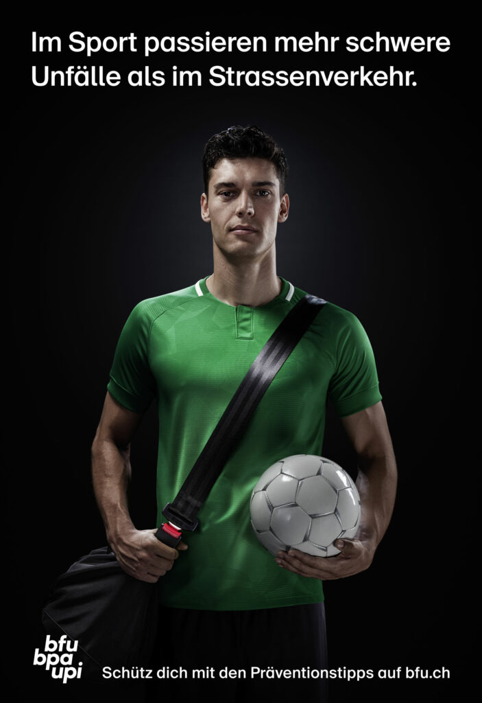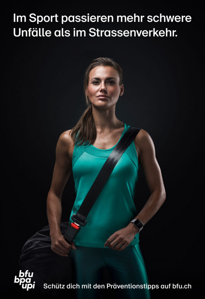 Das Resultat: Eine Kampagne, die prägnant den Bogen vom Strassenverkehr zum Sport spannt. Als visuelles Leitmotiv wurde der Sicherheitsgurt in die Welt des Sports übertragen – mit der eigens kreierten BFU-Sporttasche. Denn so einfach, wie man sich im Auto schützt, so einfach kann man sich jetzt auch beim Sport schützen.