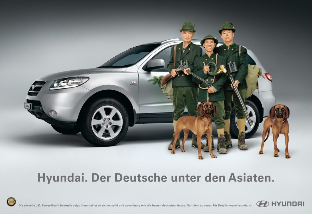 Deshalb haben wir im Jahr 2006 eine selbstbewusste neue Positionierung geschaffen: Hyundai, der Deutsche unter den Asiaten. Denn Qualität wird in Umfragen fast automatisch mit deutschen Fahrzeugen in Verbindung gebracht. Die freche Hyundai-Kampagne ist auch den Werbeverantwortlichen von VW eingefahren. In einer Replik im Sonntagsblick bezeichneten sie den VW Golf als «Der Asiate unter den Deutschen».