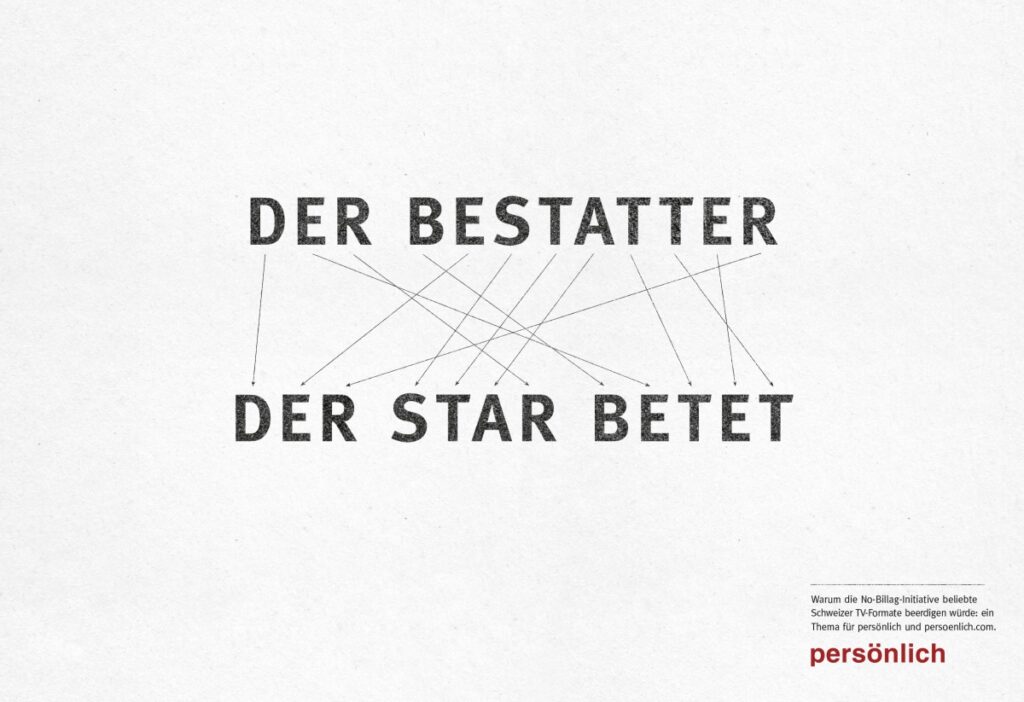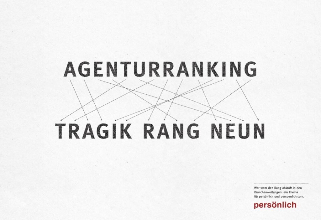 Schön, dass der Verlag auch mit seinen eigenen Kampagnen beweist, dass er an die Kraft guter Kommunikation glaubt. Und dafür schon seit vielen Jahren auf Ruf Lanz setzt. Die pointierten Kampagnen wurden mehrfach ausgezeichnet, u. a. vom ADC Switzerland und der internationalen Epica-Jury in Amsterdam. Zuletzt wurden die e-Boards mit den Anagrammen beim Swiss Poster Award mit Gold in der Kategorie Digital Out of Home gekrönt.