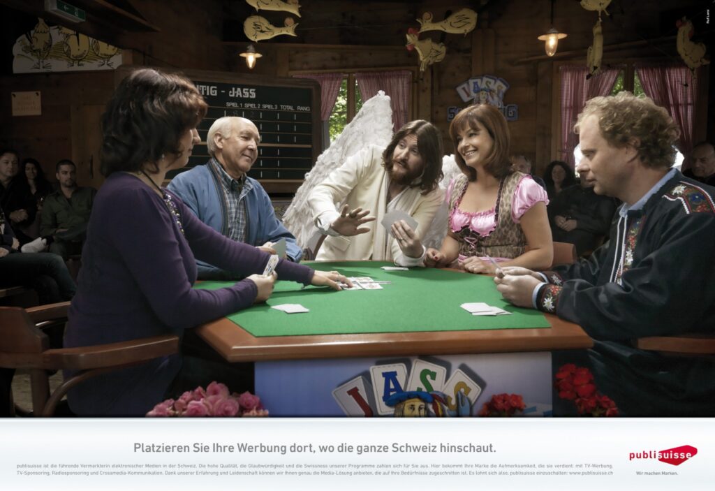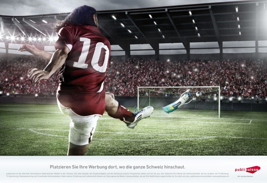 Wer mit publisuisse wirbt, profitiert von der starken emotionalen Bindung der Schweizer Bevölkerung zu den Programmen von SRG SSR. Deshalb haben wir in der Kampagne bekannte Werbefiguren mit populären Sendegefässen und deren Moderatorinnen und Moderatoren zusammen gebracht. Zusätzlich überraschten wir die Werbetreibenden regelmässig mit kreativen Interventionen wie der Bannerkampagne «Grosse Marken passen nicht in kleine Formate» oder mit augenzwinkernden aktuellen Sujets.