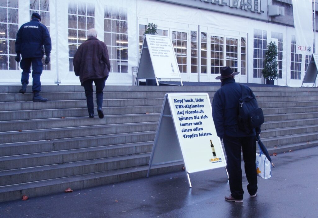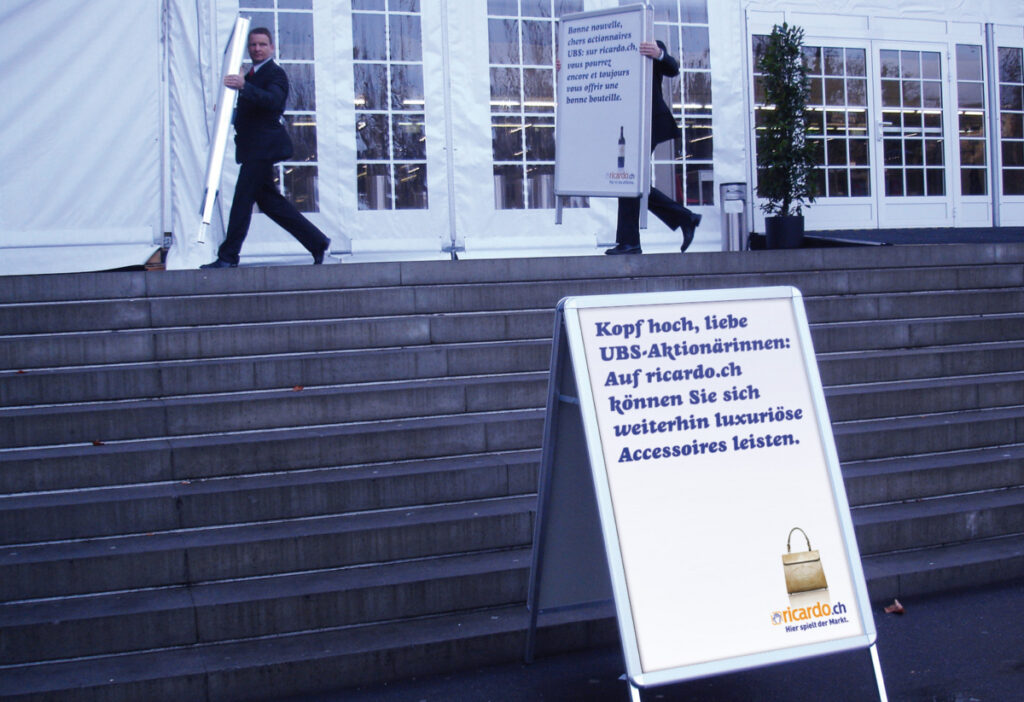 In der Finanzkrise 2008 lud die UBS zur ausserordentlichen GV. Wir zeigten den gebeutelten Aktionärinnen und Aktionären: Dank Ricardo.ch könnt ihr euch weiterhin Luxusartikel leisten. Resultat: Aufsehen vor Ort und willkommene Gratiswerbung in den Medien.