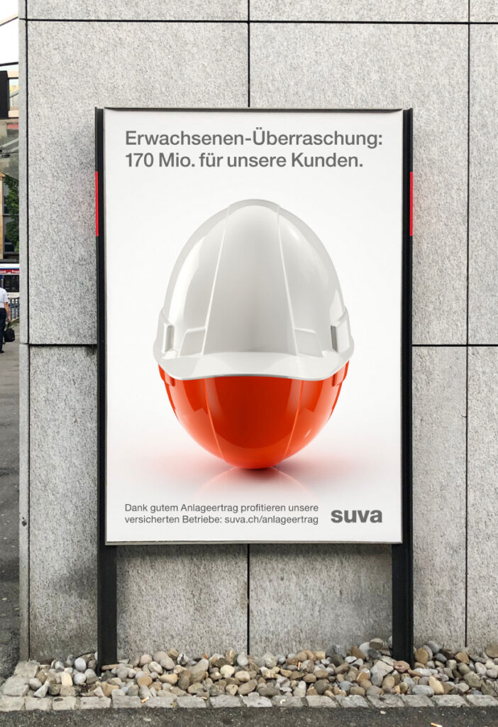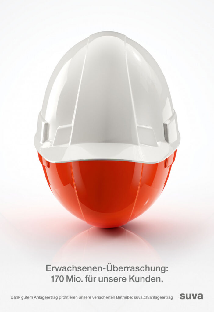 Hier wird die Botschaft mit einer plakativen Analogie herausgeschält: Zwei Bauhelme erinnern an das beliebte Überraschungs-Ei. Denn die Schweizer Baubranche ist bei der Suva versichert. Werbemittel: Digitale und analoge Plakate, Inserate, Flyer, Banner und Social Media Posts.