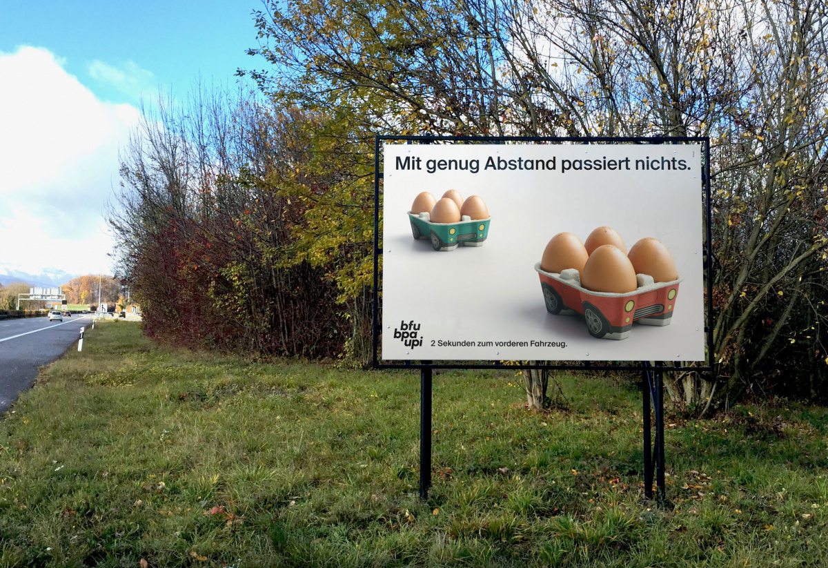 Diese Kampagne schält den Sicherheitsaspekt von genügend Abstand im Verkehr überraschend heraus. Hauptwerbemittel: Plakate an Autostrassen in der ganzen Schweiz.
