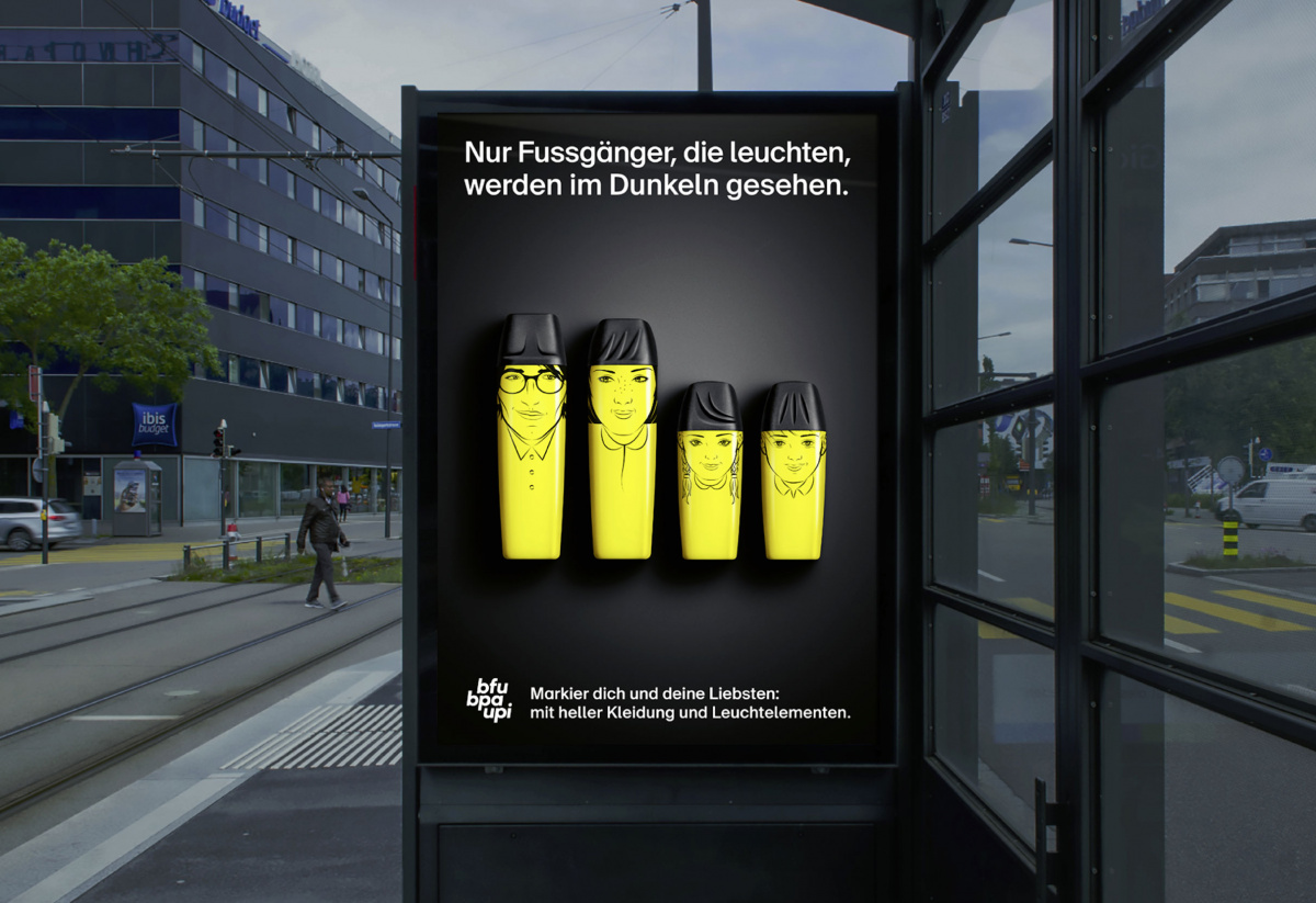Nur wer leuchtet, wird im Dunkeln rechtzeitig gesehen. Dies veranschaulicht die Kampagne mit einer einleuchtenden Analogie. Hauptwerbemittel: Strassenplakate in der dunklen Winterzeit.
