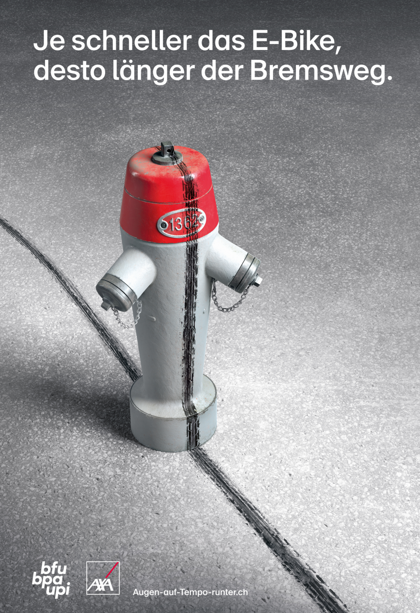 Wegen ihrer höheren Geschwindigkeit haben E-Bikes einen viel längeren Bremsweg als klassische Velos. Dies dramatisiert die Gemeinschaftskampagne von BFU und AXA pointiert auf allen Kanälen.
