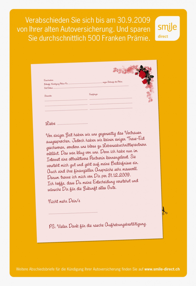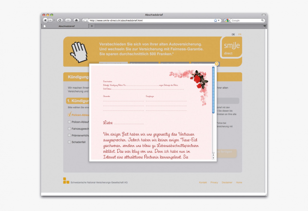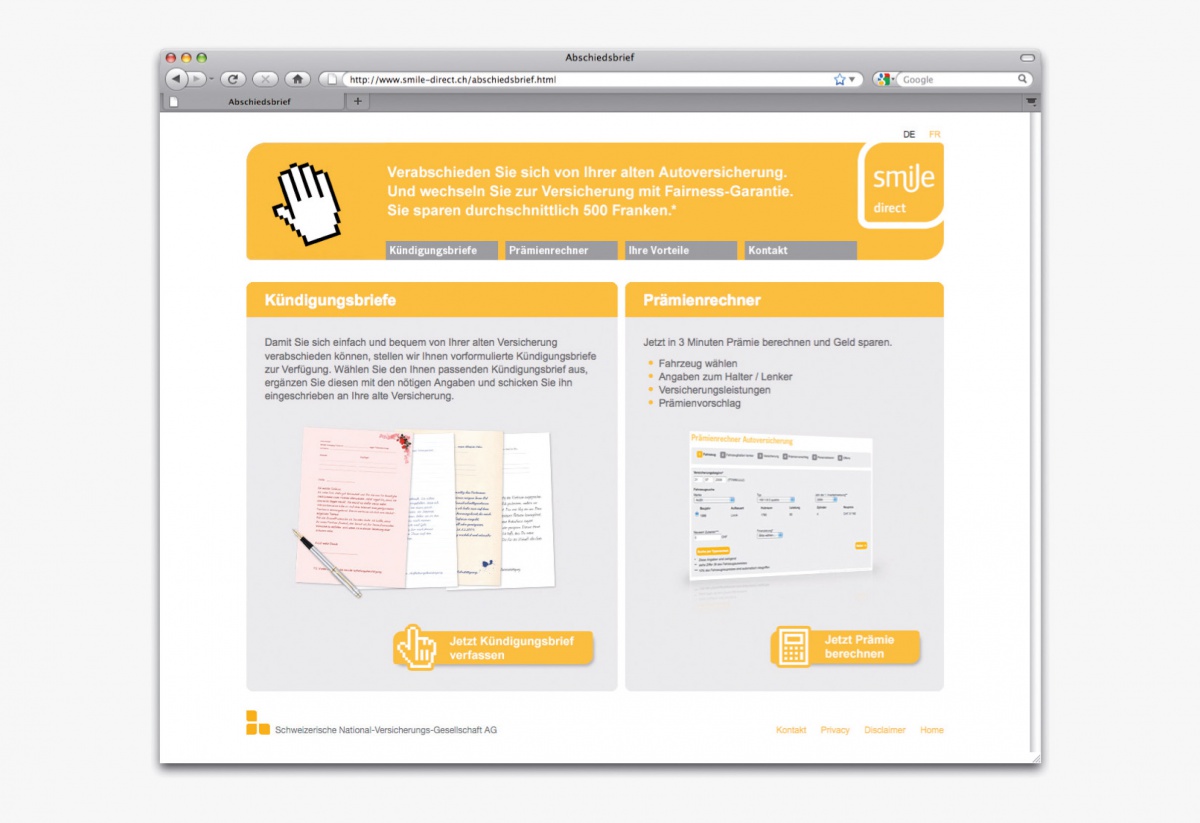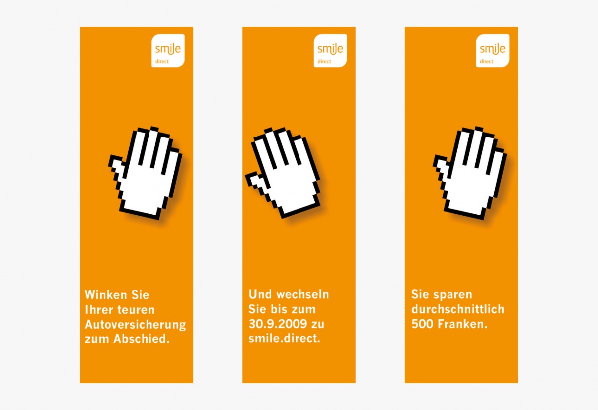 Den Versicherungswechsel einfach gemacht: Banner mit winkenden Hand-Icons forderten zum Wechsel zu smile.direct auf und führten auf eine Microsite. Hier konnten die User ihr Prämiensparpotenzial berechnen und unter mehreren Abschiedsbriefen an die teure alte Versicherung auswählen.