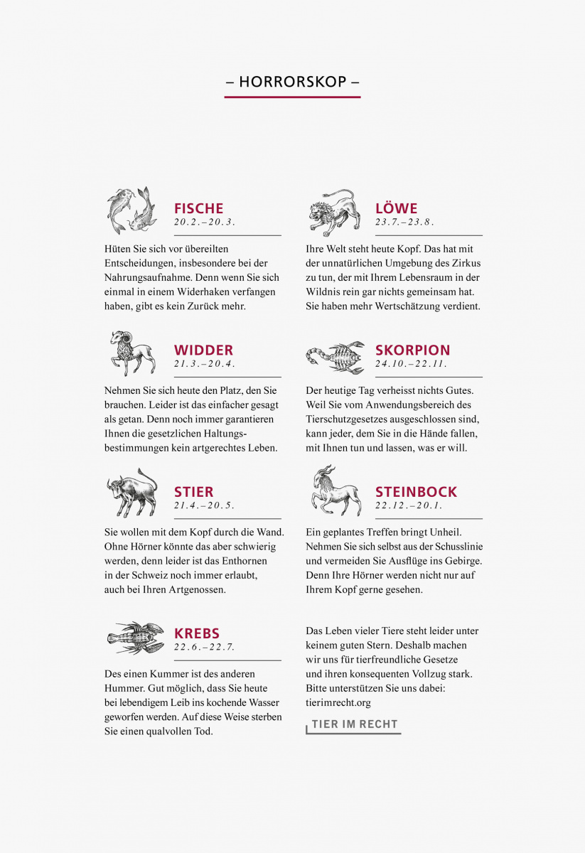 Horoskope erfreuen sich in der Bevölkerung grosser Beliebtheit. Deshalb nutzten wir die Tiersternzeichen kreativ, um in einem «Horrorskop» auf Missstände hinzuweisen.